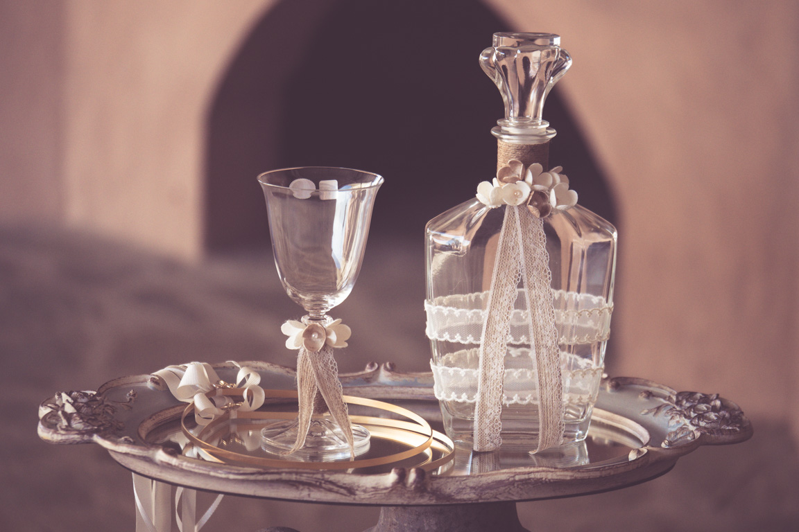 Σετ γάμου με διακόσμηση διακριτική και ουδέτερη για να ταιριάζει με τα στέφανα της επιλογής σας.
