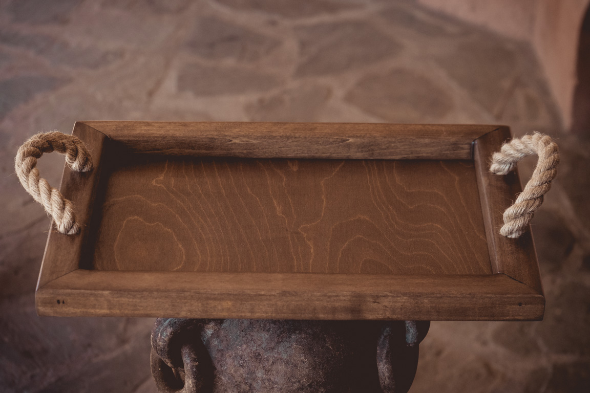 (Δίσκος ξύλινος από μασίφ ξύλο πεύκου με διαστάσεις 49*37, η καράφα και το ποτήρι είναι κρυστάλλινα)